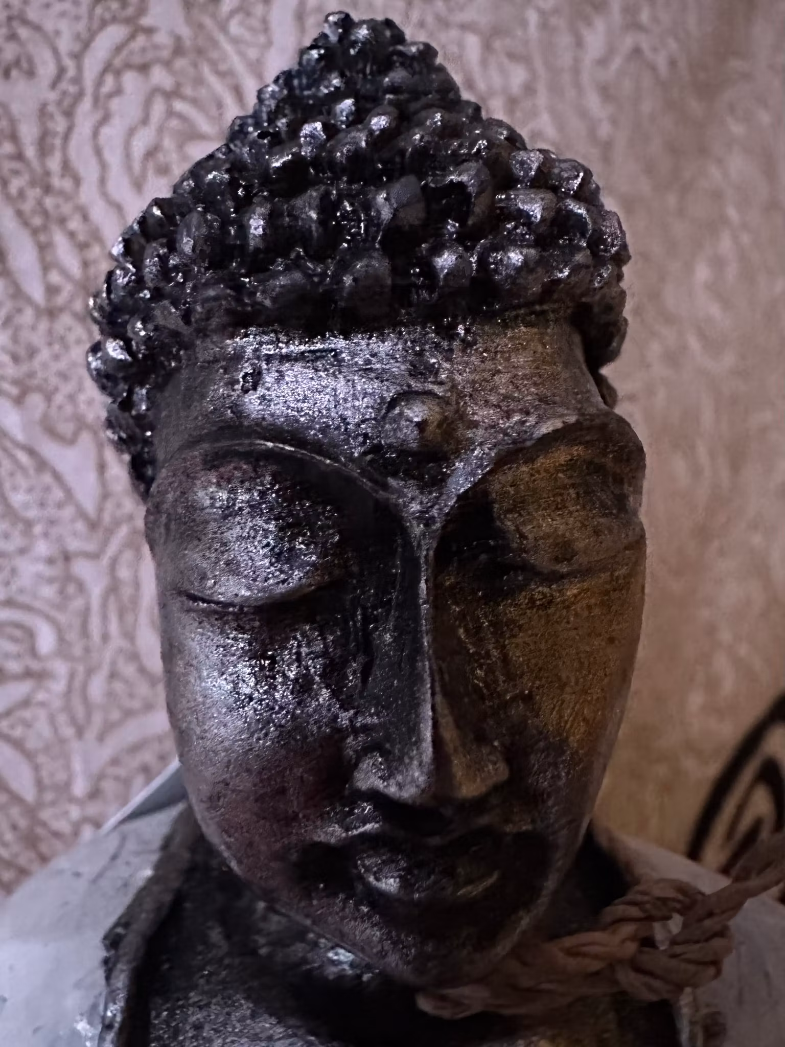 Buddhan visar båda händerna i knät med baksidan av höger hand i handflatan på vänster hand och tummarna som rör varandra, vilket bildar en mystisk triangel. Detta är meditationsmudran, som symboliserar visdom.