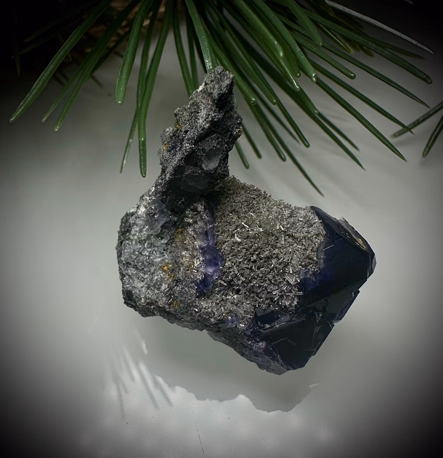 Kubisk Svart Fluorit med Lila Fluorit, Kvarts och Pyrit