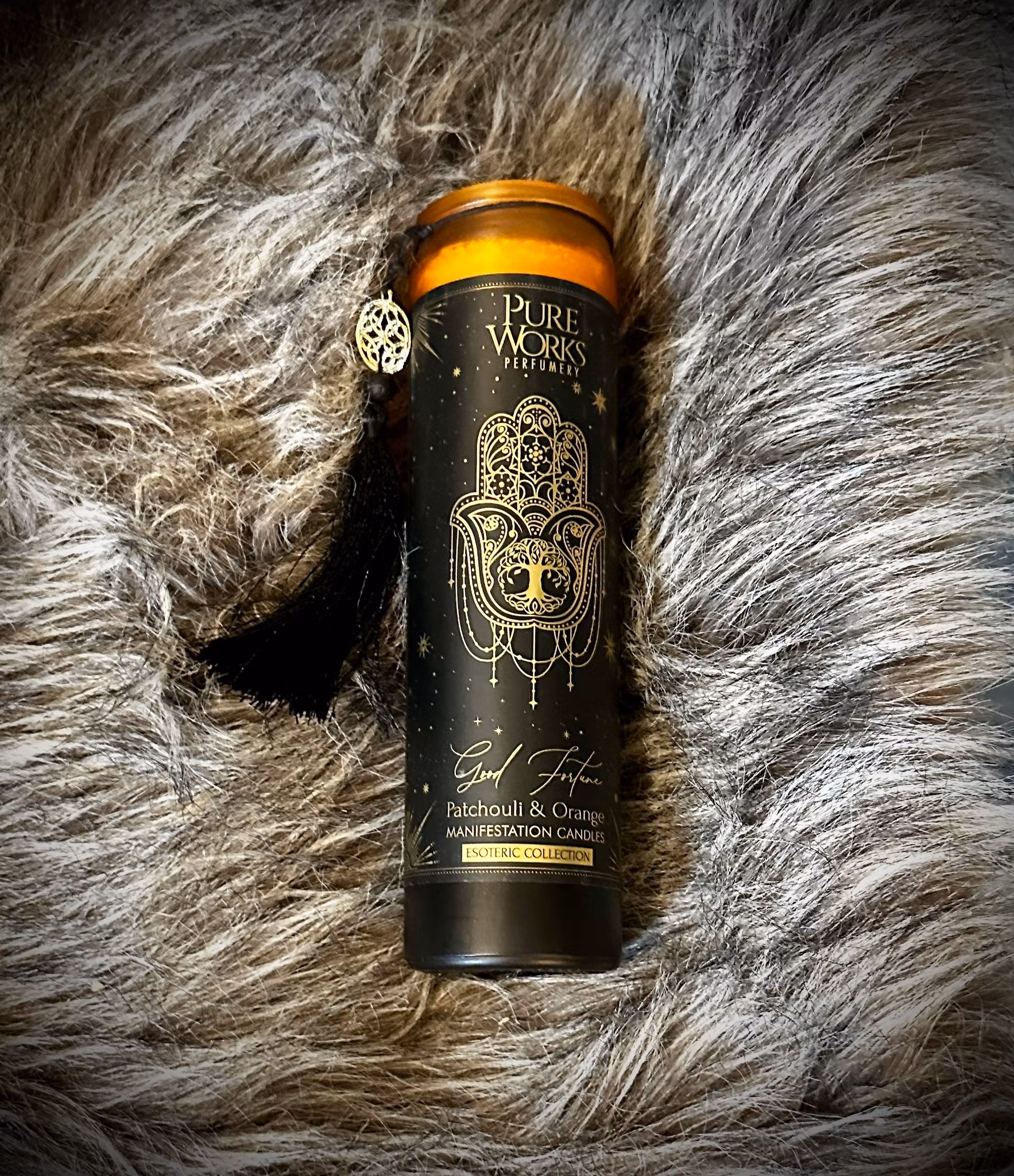 Manifestationsljus i en hög, färgad glasbehållare med eteriska oljor och en dekorativ tofs, hälld för hand.