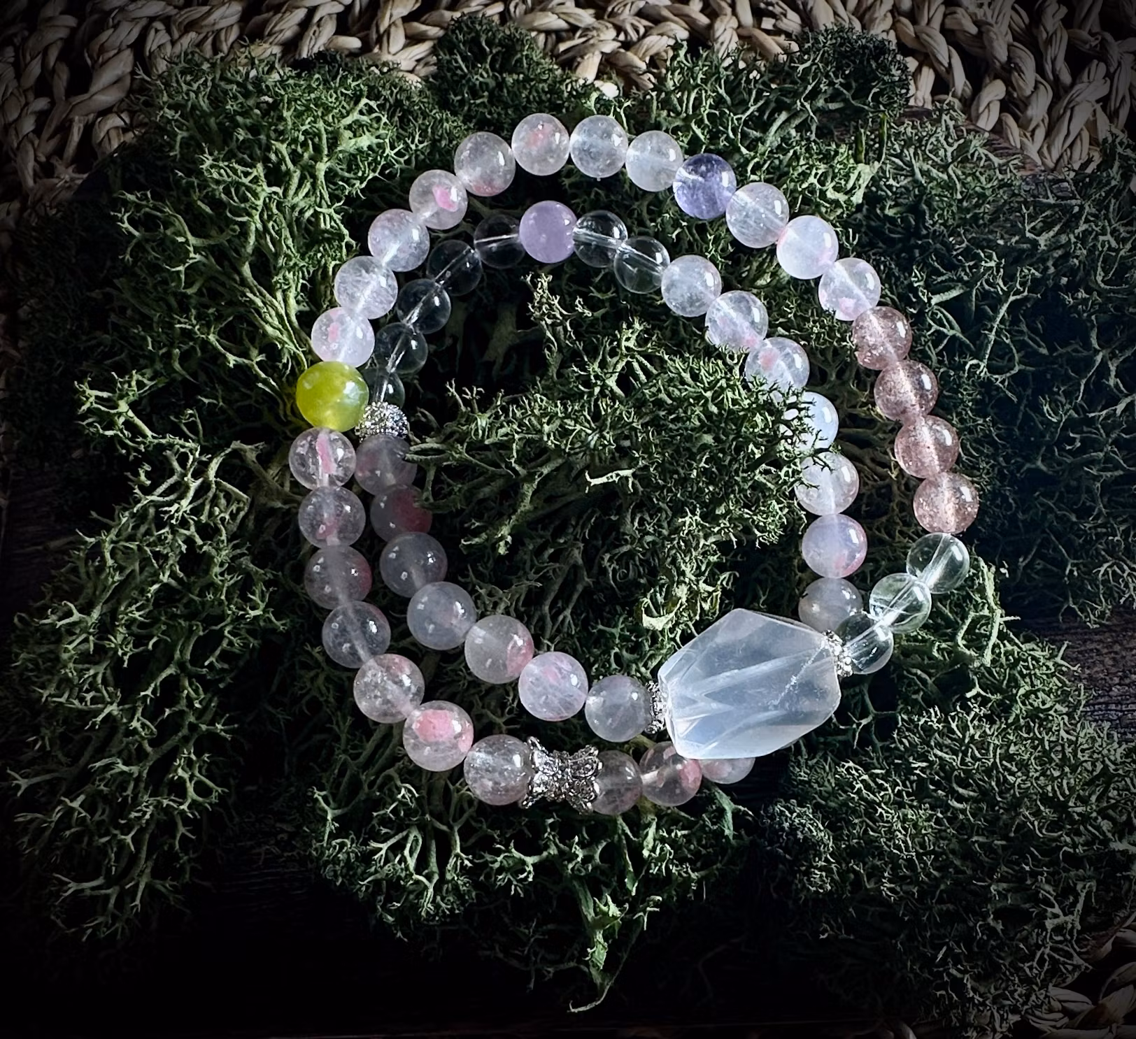 Wrap Mix Is-Rhodonit | Rhodonit i Kvarts, Jordgubbskvarts, Ametist, Serpentin och Himalayakvarts samt en Madagaskar Rosenkvarts i fri form