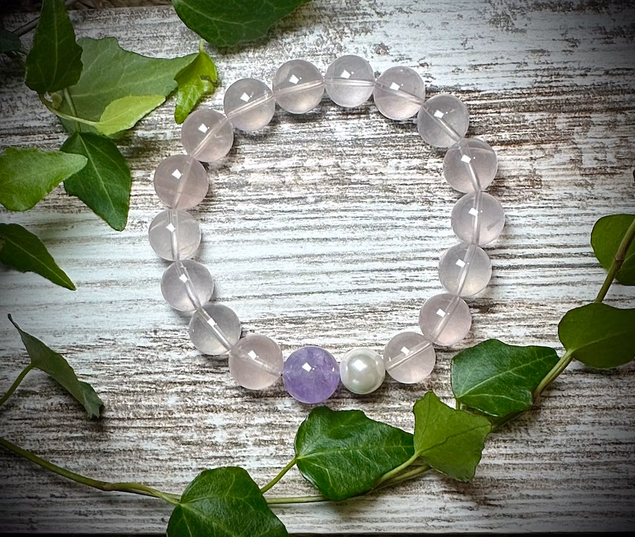 Rosenkvarts Armband med Ametist och en Naturlig Pärla