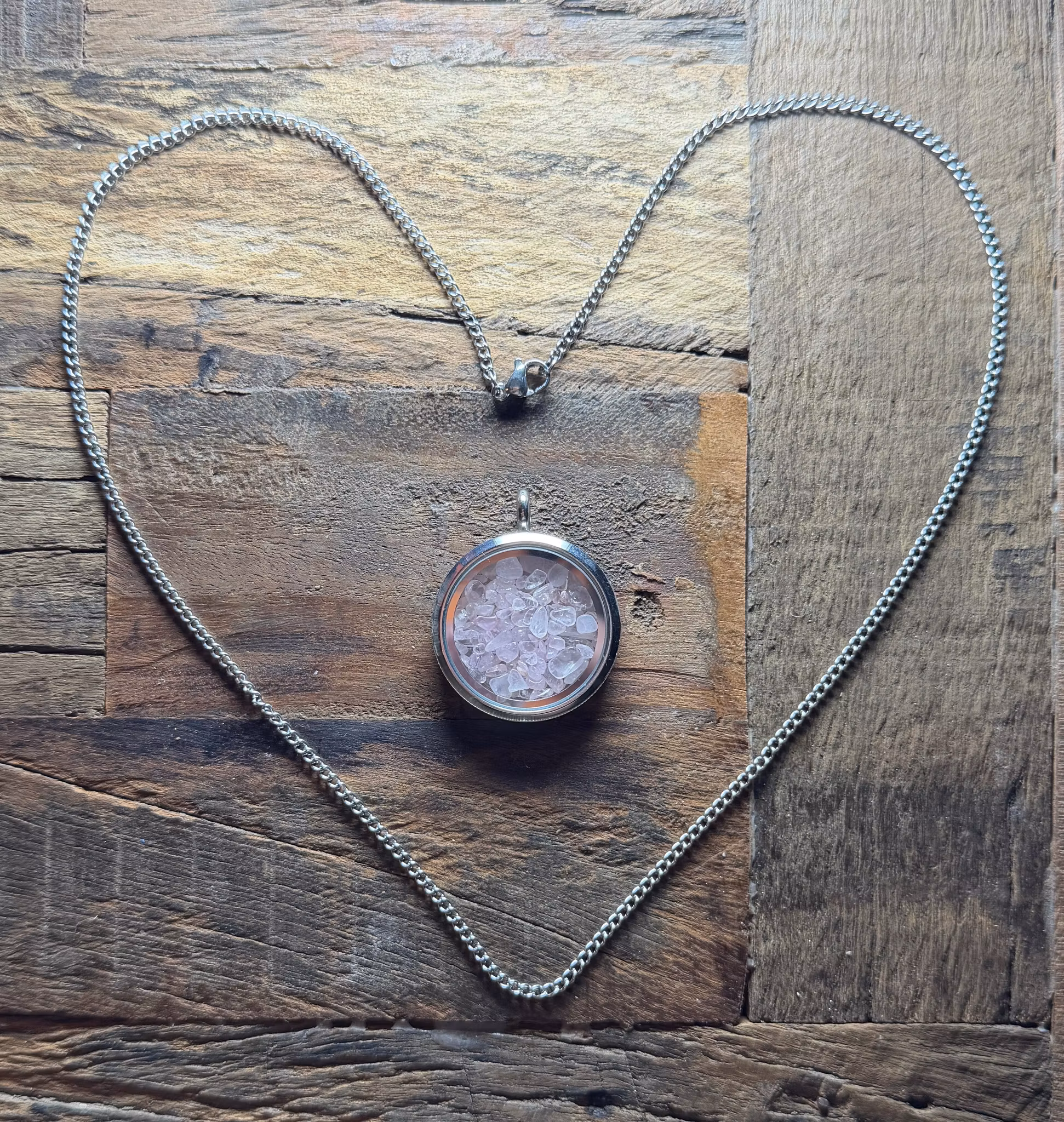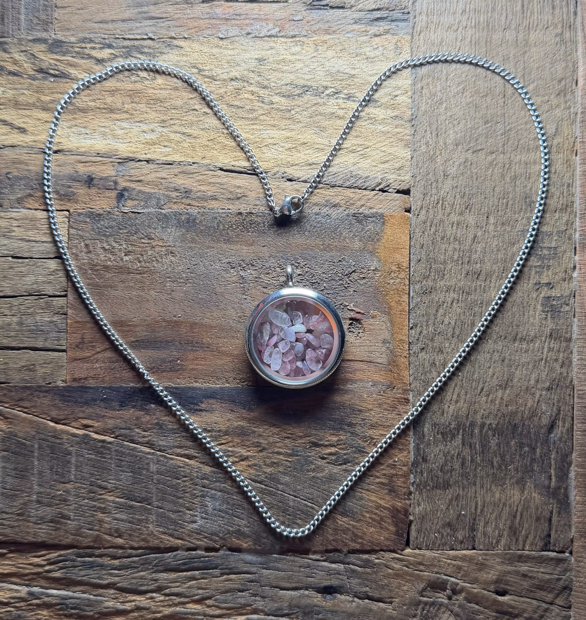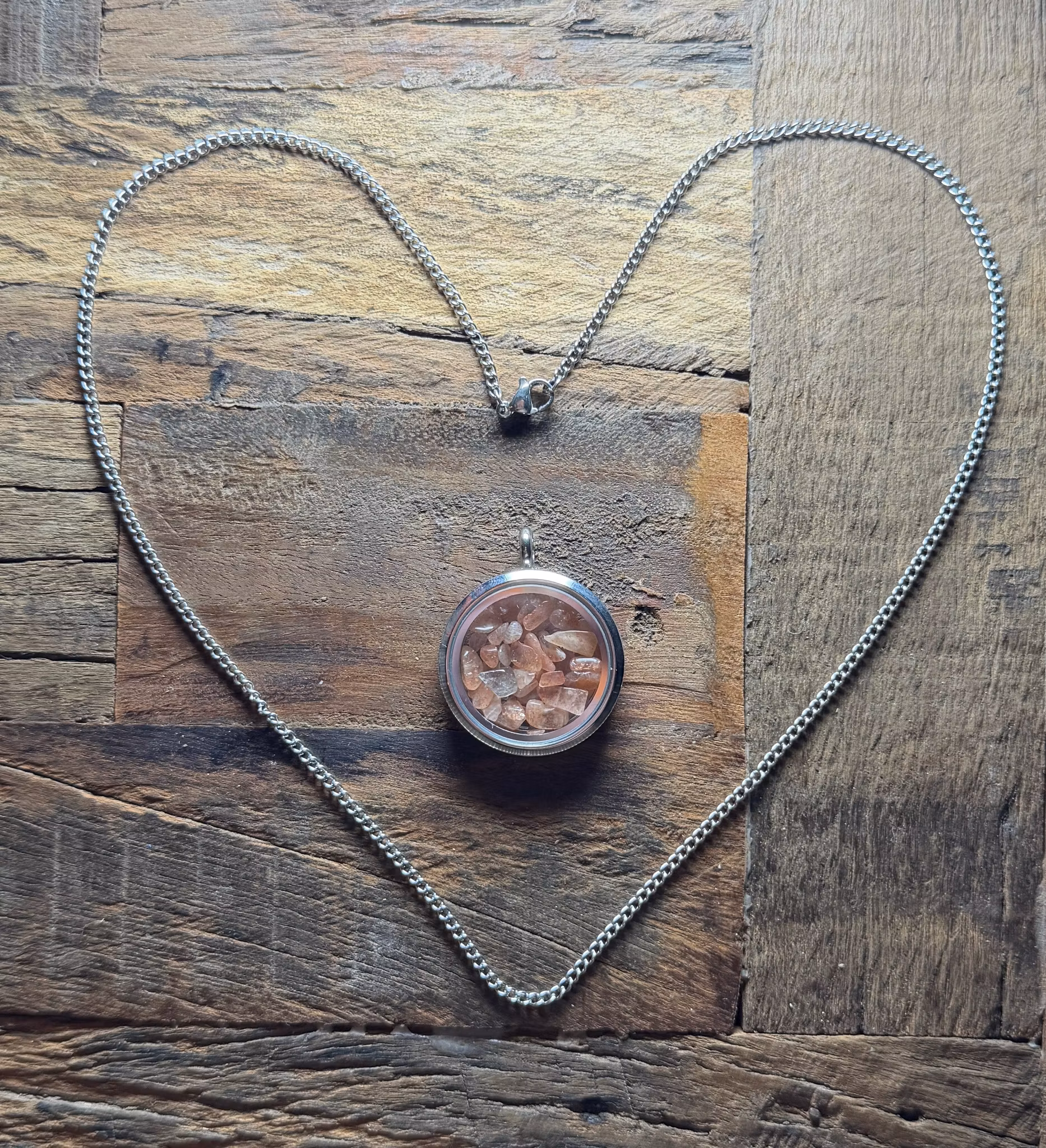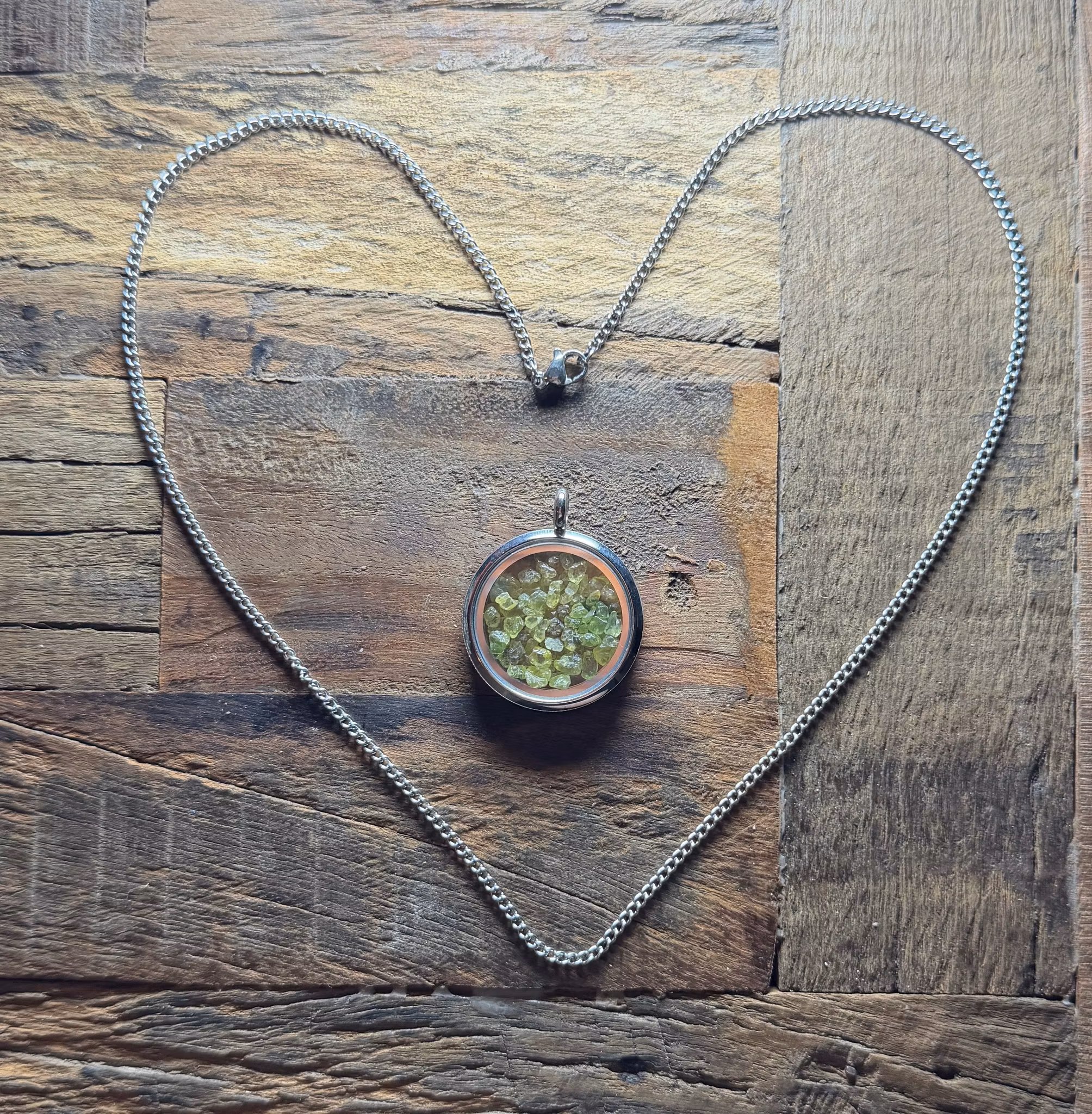 Öppningsbar Minnesberlock med tillhörande kedja i rostfritt stål.